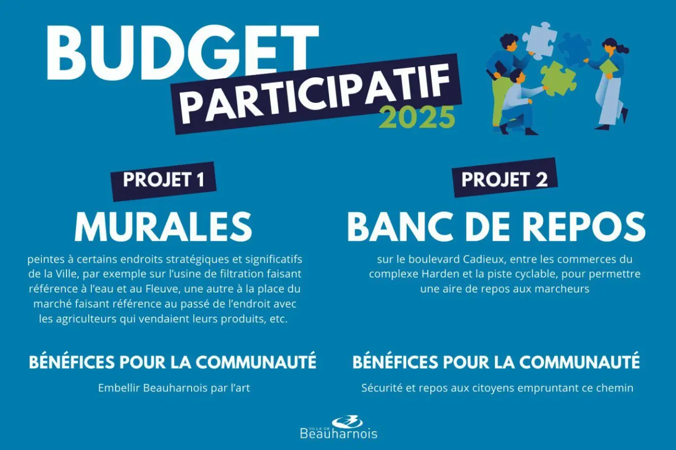 Beauharnois a été ravie de lancer son tout premier budget participatif, un processus innovant qui a permis aux citoyens de participer activement à la prise de décision publique. Grâce à cette initiative, les résidents ont pu décider comment une partie du budget de la Ville serait utilisée.